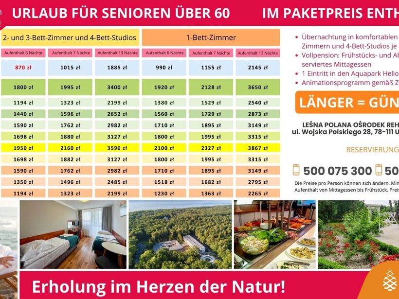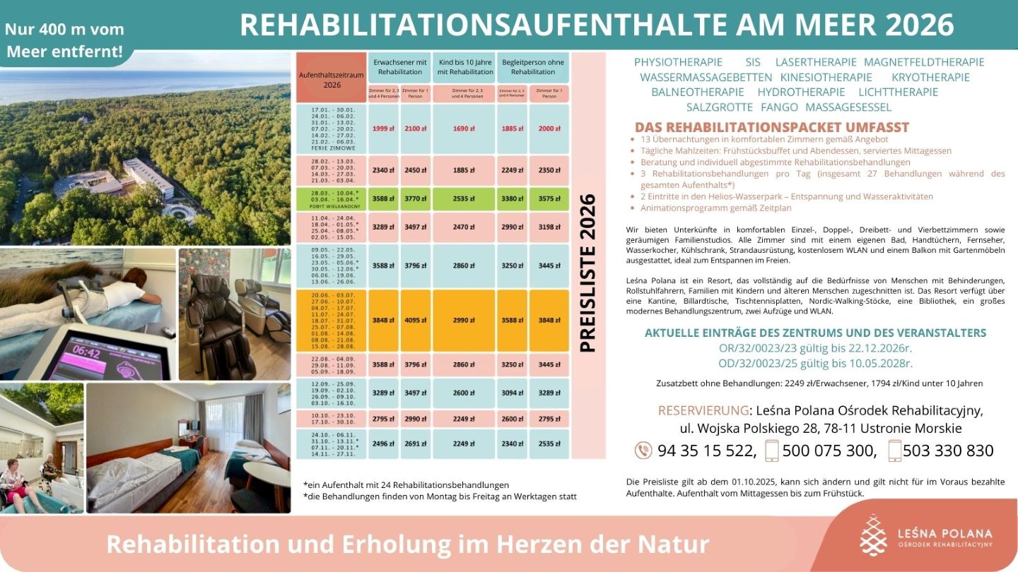 Um hochwertige Dienstleistungen anzubieten, verwendet der Service Cookies, die im Speicher des Browsers gespeichert sind. Ausführliche Informationen über den Zweck ihrer Verwendung, einschließlich der Verarbeitung von Benutzeraktivitätsdaten und der Personalisierung von Werbung, sowie die Möglichkeit, Cookie-Einstellungen zu ändern, finden Sie in der Datenschutzrichtlinie. Durch Klicken auf ALLE AKZEPTIEREN stimmen Sie der Nutzung von Technologien wie Cookies und der Verarbeitung Ihrer personenbezogenen Daten durch Leśna Polana Ośrodek Rehabilitacyjny Sp. z o. o., Wojska Polskiego 28, 78-111, Ustronie Morskie, die im Internet gesammelt werden, wie z. B. IP-Adressen und Cookie-Identifikatoren, zu Analyse- und Marketingzwecken zu (einschließlich automatisierter Anzeigenausrichtung, Messung ihrer Wirksamkeit und Verarbeitung von Benutzerdaten zu Analysezwecken). Änderungen der Cookie-Einstellungen und detaillierte Zustimmungspräferenzen können Sie in vornehmen.