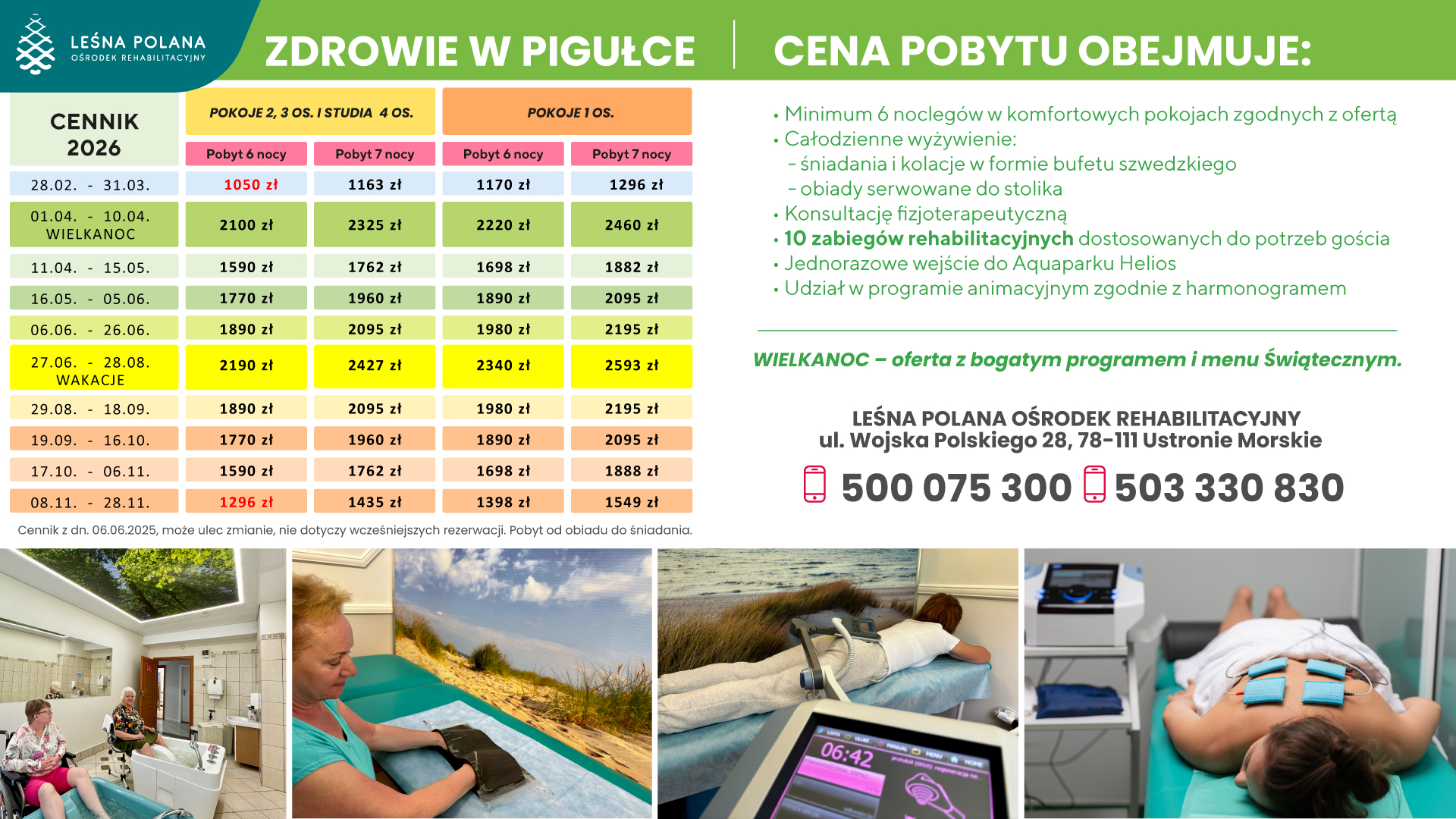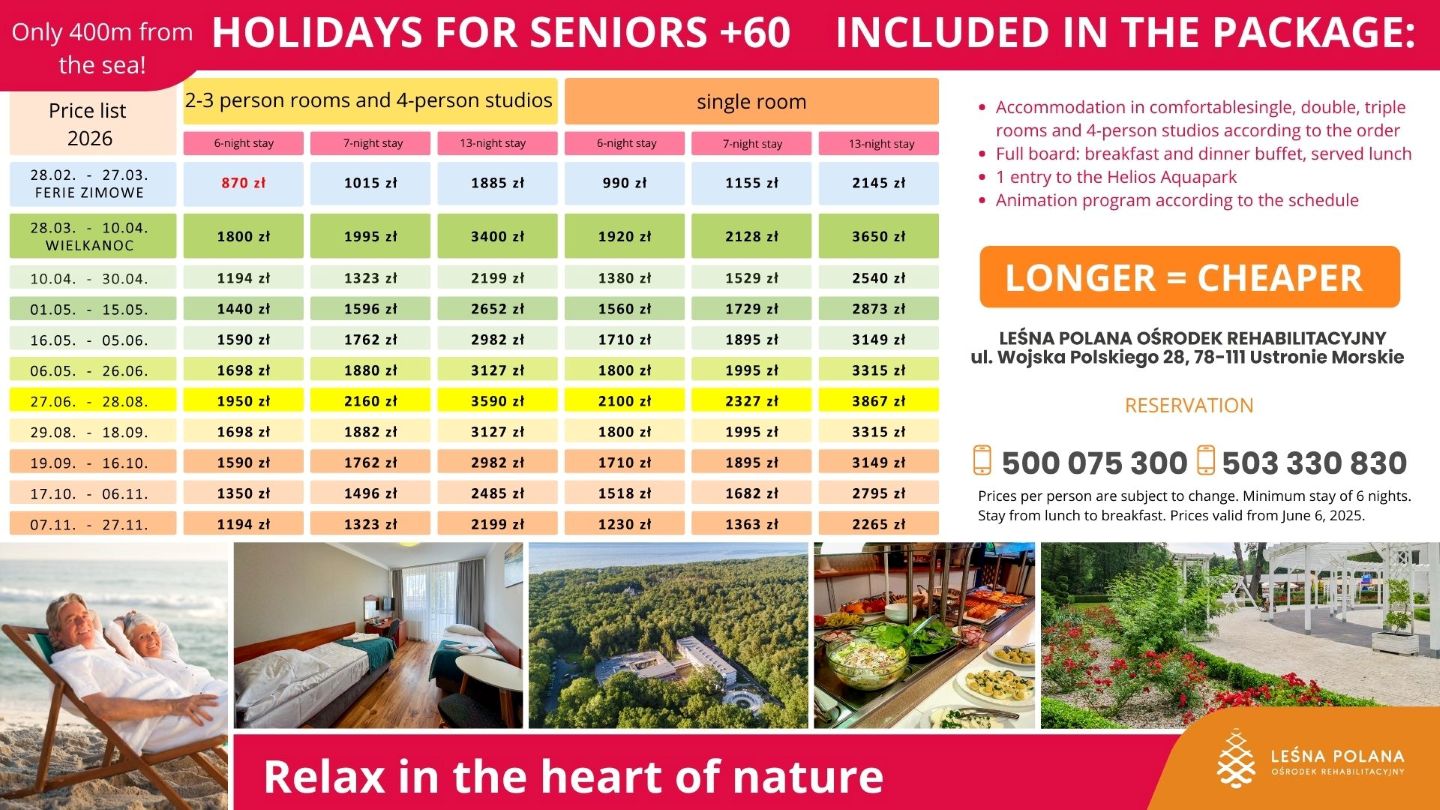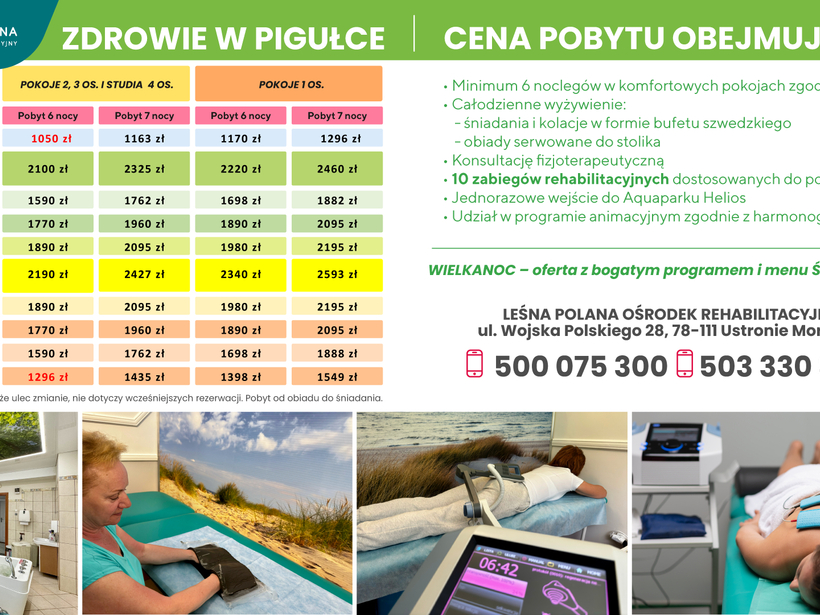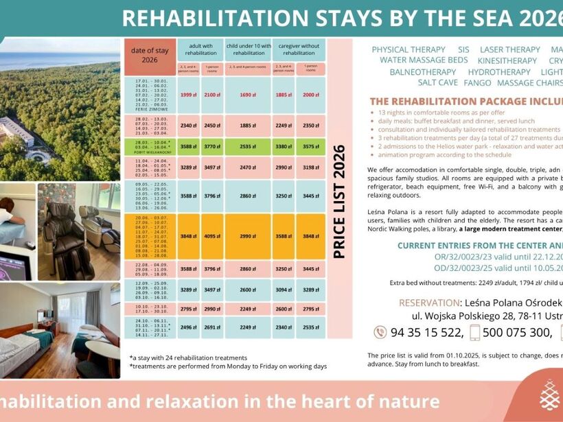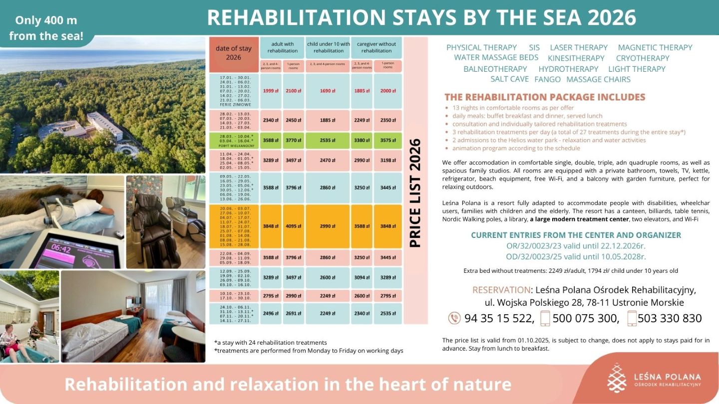 In order to provide services at the highest level, the Website uses cookies saved in the browser's memory. Detailed information about the purpose of their use, including processing of user activity data and advertising personalization, as well as the possibility to change cookie settings, can be found in the Privacy Policy. By clicking ACCEPT ALL, you consent to the use of technologies such as cookies and to the processing by Leśna Polana Ośrodek Rehabilitacyjny Sp. z o. o., Wojska Polskiego 28, 78-111, Ustronie Morskie, of your personal data collected on the Internet, such as IP addresses and cookie identifiers, for analytical and marketing purposes (including automated ad targeting, measuring their effectiveness, and processing user data for analytical purposes). You can change cookie settings and detailed consent preferences in .